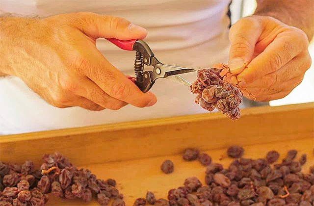 Une fois séchées et teintées d'un noir violacé irrésistible, les grappes passent par un tri impitoyable. Les meilleures sont emballées telles quelles, tandis que les autres subissent un dégrainage manuel sur des hangars en bois traditionnels ("enramás"). Armés de ciseaux, artisans et artisanes coupent chaque grain sur un plateau de bois ("formalete"), éliminant les imperfections pour le vinaigre.
